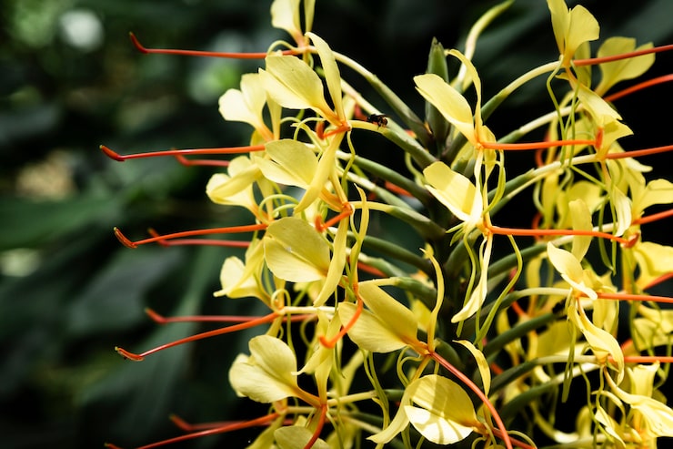 Раскрытие культуры происходит поэтапно, подобно волне. Сначала появляются крупные, пышные бутоны, за которыми следуют более мелкие. Цветки небольшие (около 1 см в длину), трубчатой формы, образованы четырьмя лепестками и собраны в соцветия, напоминающие щиток. Их окраска варьируется от белого и бежевого до оранжевого и желтого. После отцветания на их месте формируются твердые плоды, содержащие по одной семечке в каждой косточке.